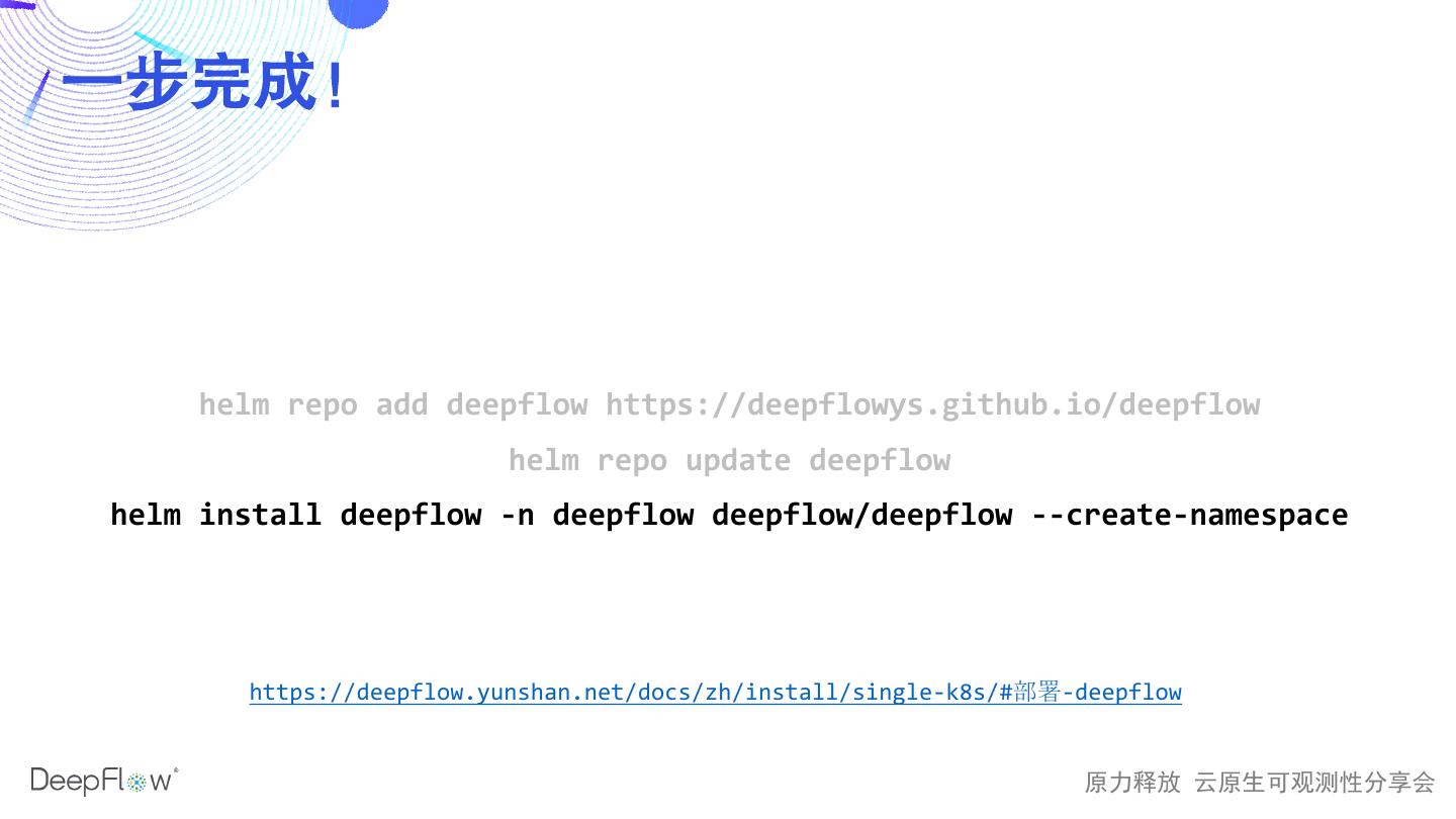6 .一步完成! helm repo add deepflow https://deepflowys.github.io/deepflow helm repo update deepflow helm install deepflow -n deepflow deepflow/deepflow --create-namespace https://deepflow.yunshan.net/docs/zh/install/single-k8s/#部署-deepflow 原力释放 云原生可观测性分享会