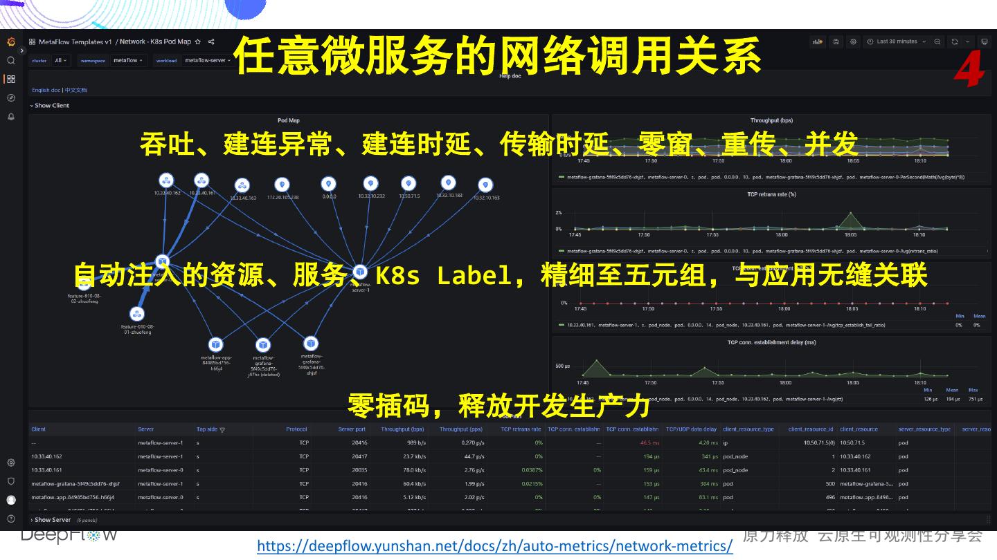 11 . 任意微服务的网络调用关系 4 吞吐、建连异常、建连时延、传输时延、零窗、重传、并发 自动注入的资源、服务、K8s Label,精细至五元组,与应用无缝关联 零插码,释放开发生产力 原力释放 云原生可观测性分享会 https://deepflow.yunshan.net/docs/zh/auto-metrics/network-metrics/