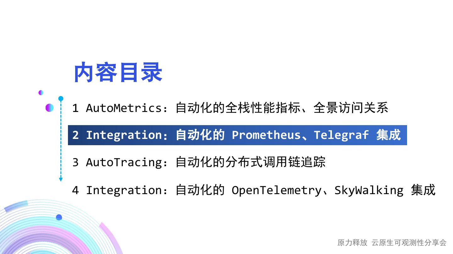 4 .内容目录 1 AutoMetrics:自动化的全栈性能指标、全景访问关系 2 Integration:自动化的 Prometheus、Telegraf 集成 3 AutoTracing:自动化的分布式调用链追踪 4 Integration:自动化的 OpenTelemetry、SkyWalking 集成 原力释放 云原生可观测性分享会