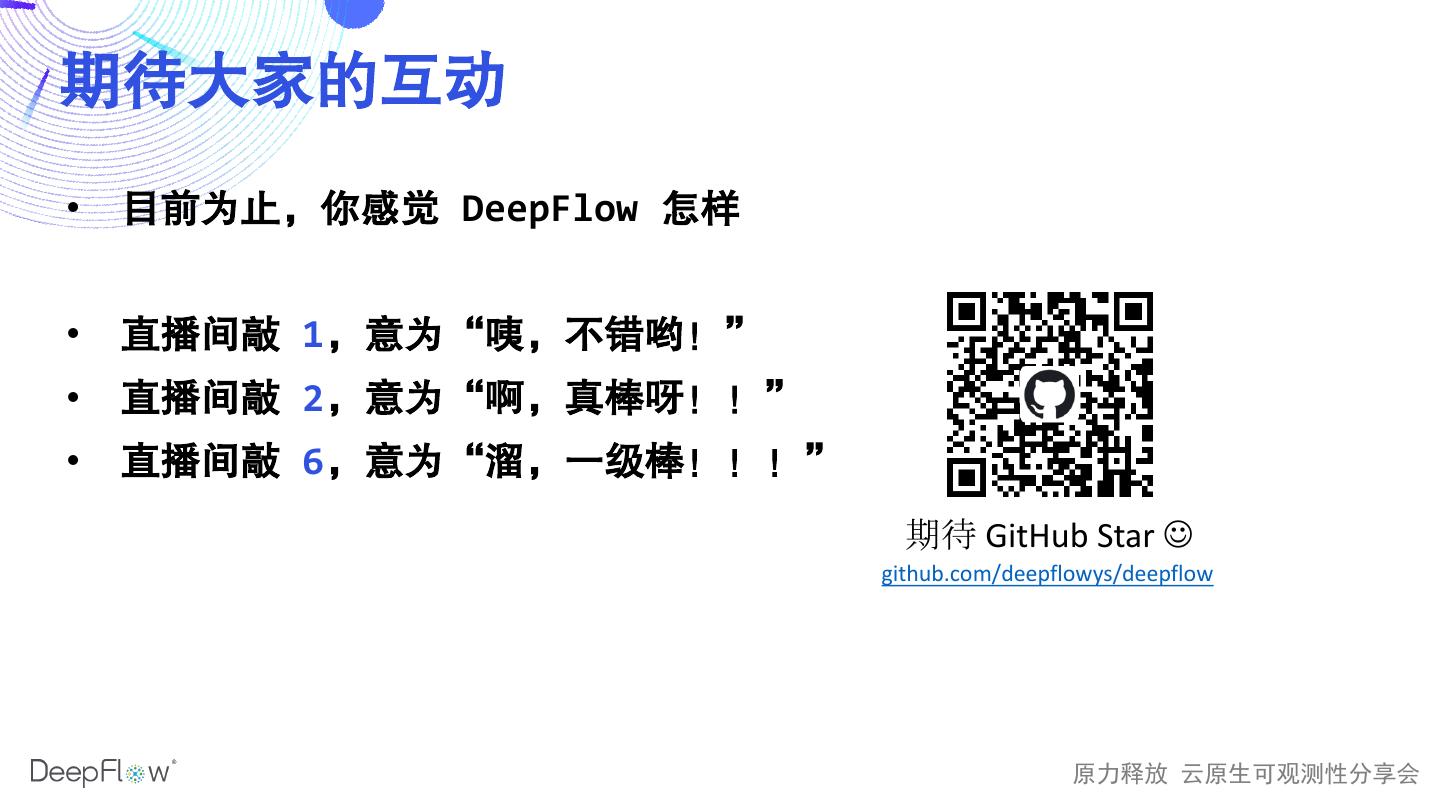 16 .期待大家的互动 • 目前为止,你感觉 DeepFlow 怎样 • 直播间敲 1,意为“咦,不错哟!” • 直播间敲 2,意为“啊,真棒呀!!” • 直播间敲 6,意为“溜,一级棒!!!” 期待 GitHub Star J github.com/deepflowys/deepflow 原力释放 云原生可观测性分享会