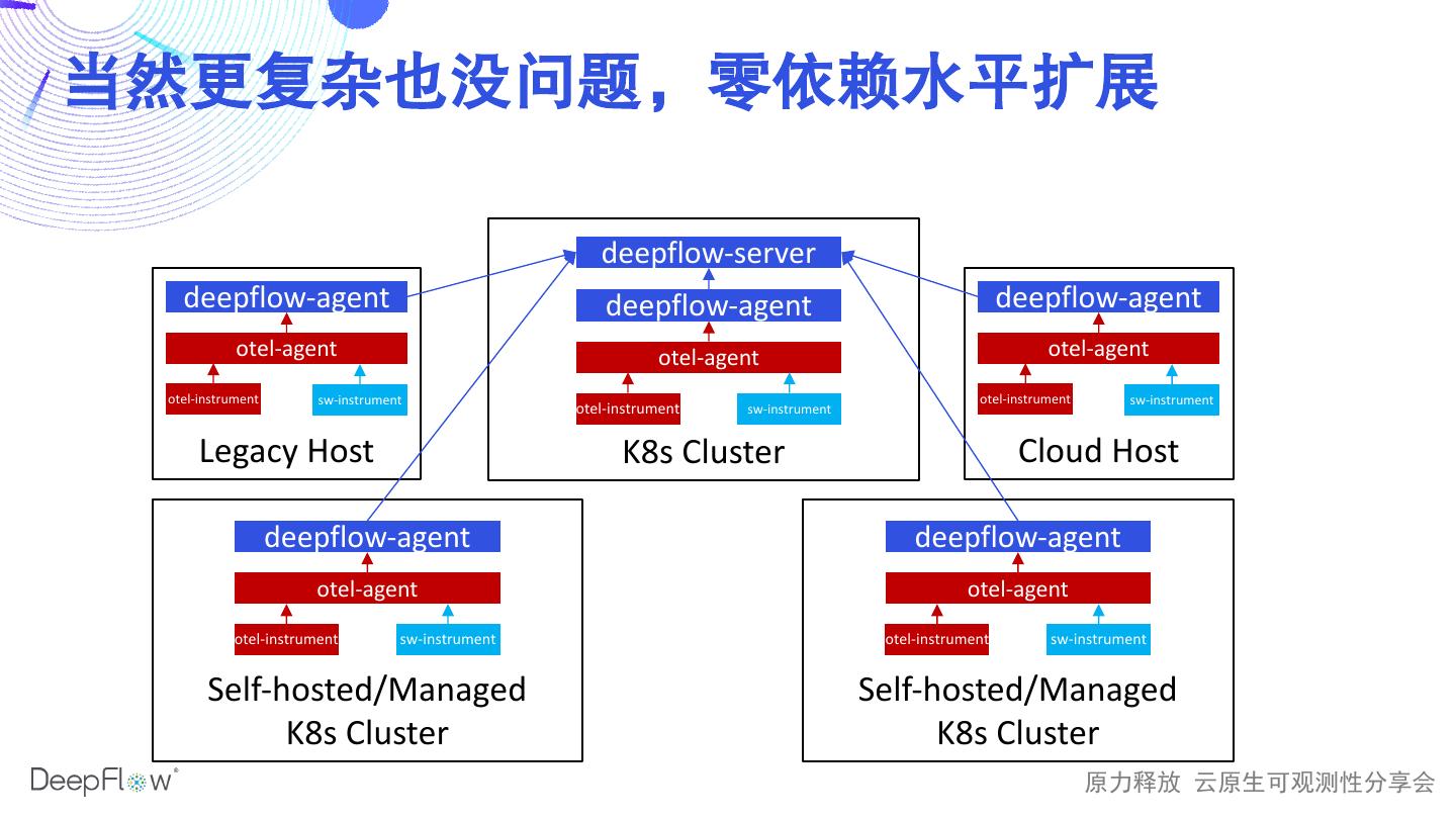 7 .当然更复杂也没问题,零依赖水平扩展 • All-in-One 快速部署 • 监控传统服务器 • 监控单个 K8s 集群 • 监控云服务器 • 监控多个 K8s 集群 • 监控托管 K8s 集群 deepflow-server deepflow-agent deepflow-agent deepflow-agent Legacy Host K8s Cluster Cloud Host deepflow-agent deepflow-agent Self-hosted/Managed Self-hosted/Managed K8s Cluster K8s Cluster https://deepflow.yunshan.net/docs/zh/install/overview/ 原力释放 云原生可观测性分享会