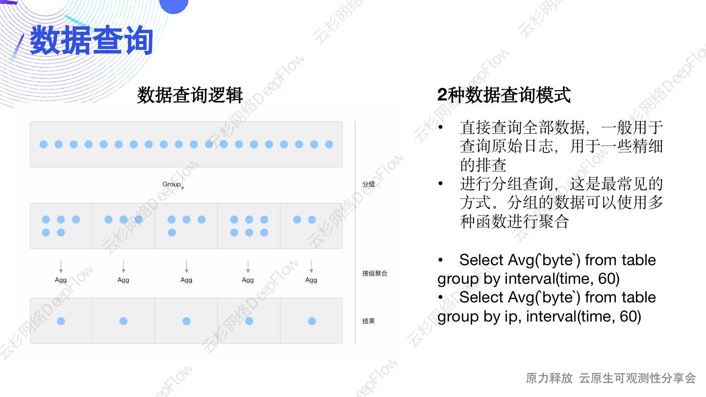 17 . 络 网 网 杉 杉 数据查询 云 云 ow o ow l pF l pF l ee pF 2种数据查询模式 ee D 数据查询逻辑 ee D 络 D 络 网 络 网 杉 • 网 直接查询全部数据,一般用于 杉 云 杉 云 查询原始日志,用于一些精细 云 ow 的排查 ow w l pF l lo • pF 进行分组查询,这是最常见的 ee pF ee D ee 方式。分组的数据可以使用多 D 络 D 络 网 络 种函数进行聚合 网 杉 网 杉 云 杉 云 云 • Select Avg(`byte`) from table ow ow group by interval(time, 60) ow Fl Fl p Fl • Select Avg(`byte`) from table ee p ee p D ee D group by ip, interval(time, 60) 络 D 络 网 络 网 杉 网 杉 云 杉 云 云 w ow lo 原力释放 云原生可观测性分享会 pF Fl