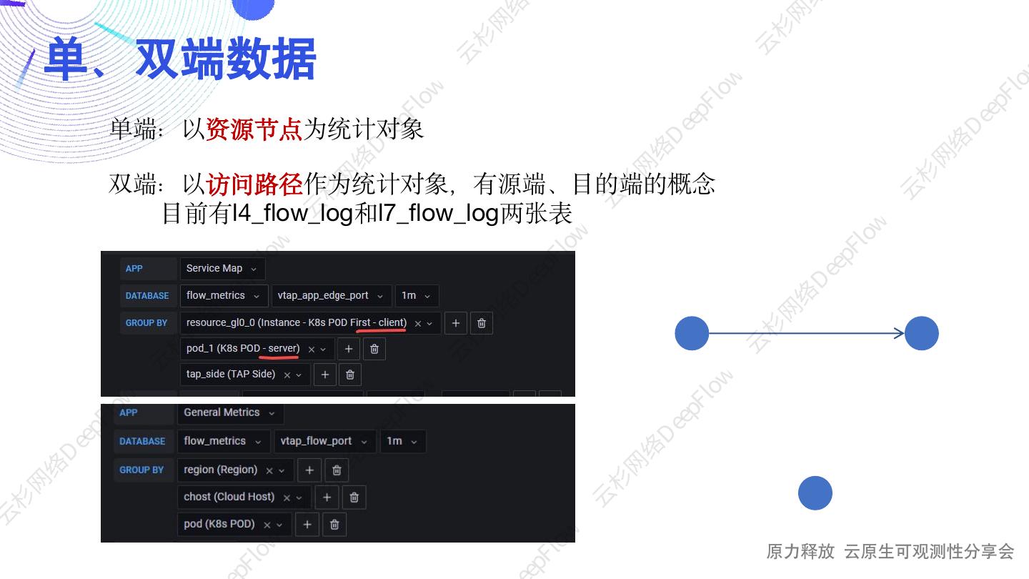 18 . 云 杉 网 络 D ee p Fl ow 云 杉 网 络 D ee Fl pF ow lo w 云 云 单、双端数据 杉 杉 网 网 络 络 D D ee p Fl ee pF 单端:以资源节点为统计对象 ow l ow 云 云 杉 杉 网 网 络 络 D pF ee lo pF l 目前有l4_flow_log和l7_flow_log两张表 w ow 云 云 杉 杉 网 网 络 络 D D ee p Fl ee pF 双端:以访问路径作为统计对象,有源端、目的端的概念 ow l ow 云 云 杉 杉 网 网 络 D ee pF l ow 云 杉 网 络 D ee pF 原力释放 云原生可观测性分享会 lo