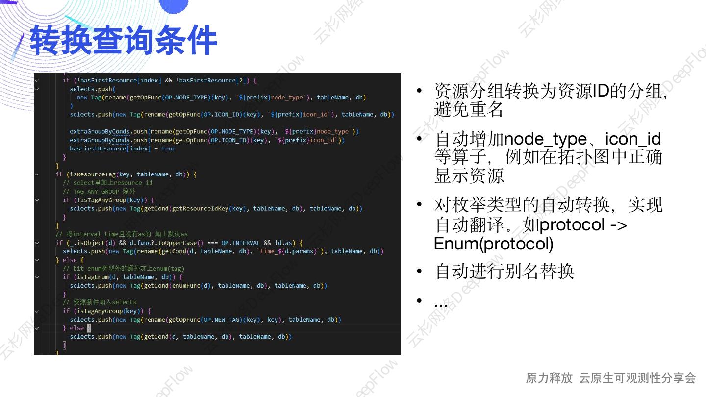 19 . 络 网 网 杉 杉 转换查询条件 云 云 ow o ow l pF l pF l ee pF • 资源分组转换为资源ID的分组, ee D ee D 络 D 络 避免重名 网 络 网 杉 网 杉 • 自动增加node_type、icon_id 云 杉 云 云 等算子,例如在拓扑图中正确 ow ow w l 显示资源 pF l lo pF ee pF ee D • 对枚举类型的自动转换,实现 ee D 络 D 络 网 自动翻译。如protocol -> 络 网 杉 网 杉 Enum(protocol) 云 杉 云 云 ow ow • 自动进行别名替换 ow Fl Fl p Fl ee p • ... ee p D ee D 络 D 络 网 络 网 杉 网 杉 云 杉 云 云 w ow lo 原力释放 云原生可观测性分享会 pF Fl