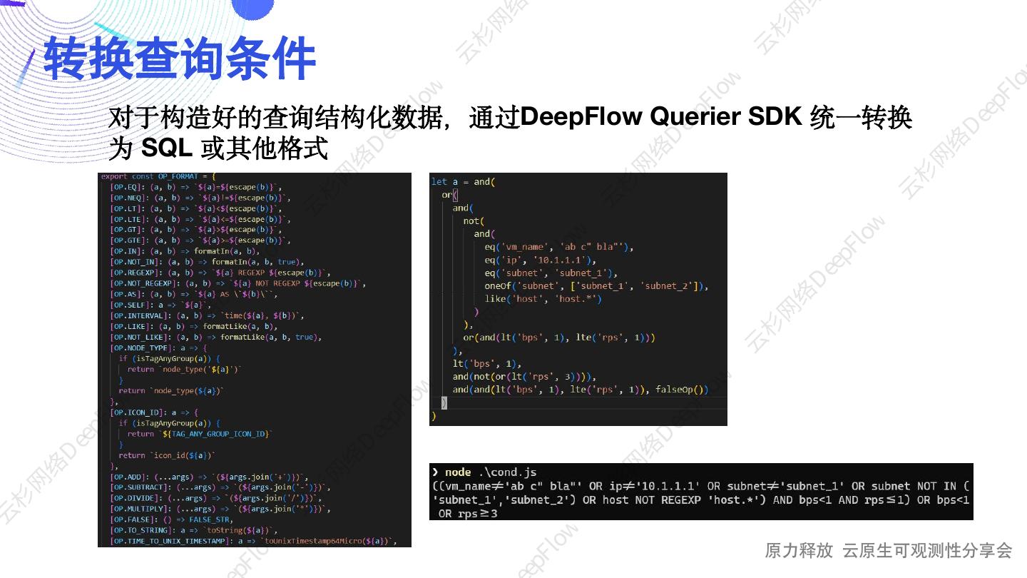 20 . 云 杉 网 络 D ee p Fl ow 云 杉 网 络 D ee Fl pF ow lo w 云 云 转换查询条件 杉 为 SQL 或其他格式 网 杉 络 网 D 络 ee D p Fl ee pF ow l ow 云 云 杉 杉 网 网 络 络 D pF ee lo pF w l ow 云 云 杉 杉 网 网 络 络 D D ee p Fl ee pF ow l ow 云 云 杉 杉 网 网 络 D ee pF l ow 云 对于构造好的查询结构化数据,通过DeepFlow Querier SDK 统一转换 杉 网 络 D ee pF 原力释放 云原生可观测性分享会 l o