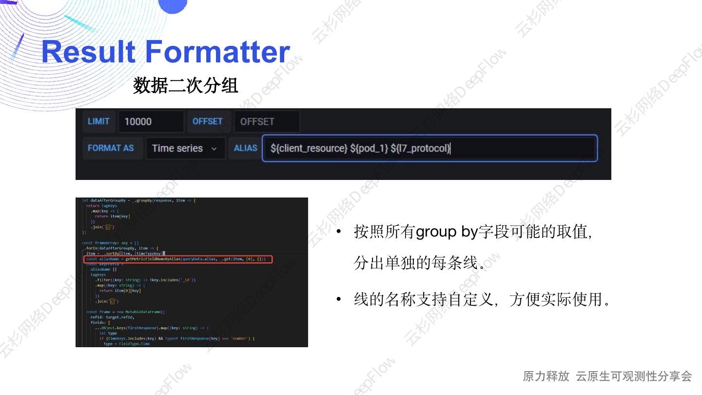 22 . 云 杉 网 络 D ee p Fl ow 云 杉 的形式 网 络 D ee Fl pF 折线图 ow lo w 云 云 杉 杉 网 网 络 络 D D ee p ee Result Formatter Fl pF ow l ow 云 云 杉 杉 网 网 络 络 D pF ee lo pF w l ow 云 云 杉 杉 网 网 络 络 D D ee p Fl ee pF ow l ow 云 云 杉 杉 网 网 络 D ee pF l ow 云 需要将转换为 data: [{time: timestamp, 组1: number}, {time: timestamp, 组2: number}, ...}] 杉 网 络 D ee pF 原力释放 云原生可观测性分享会 l o