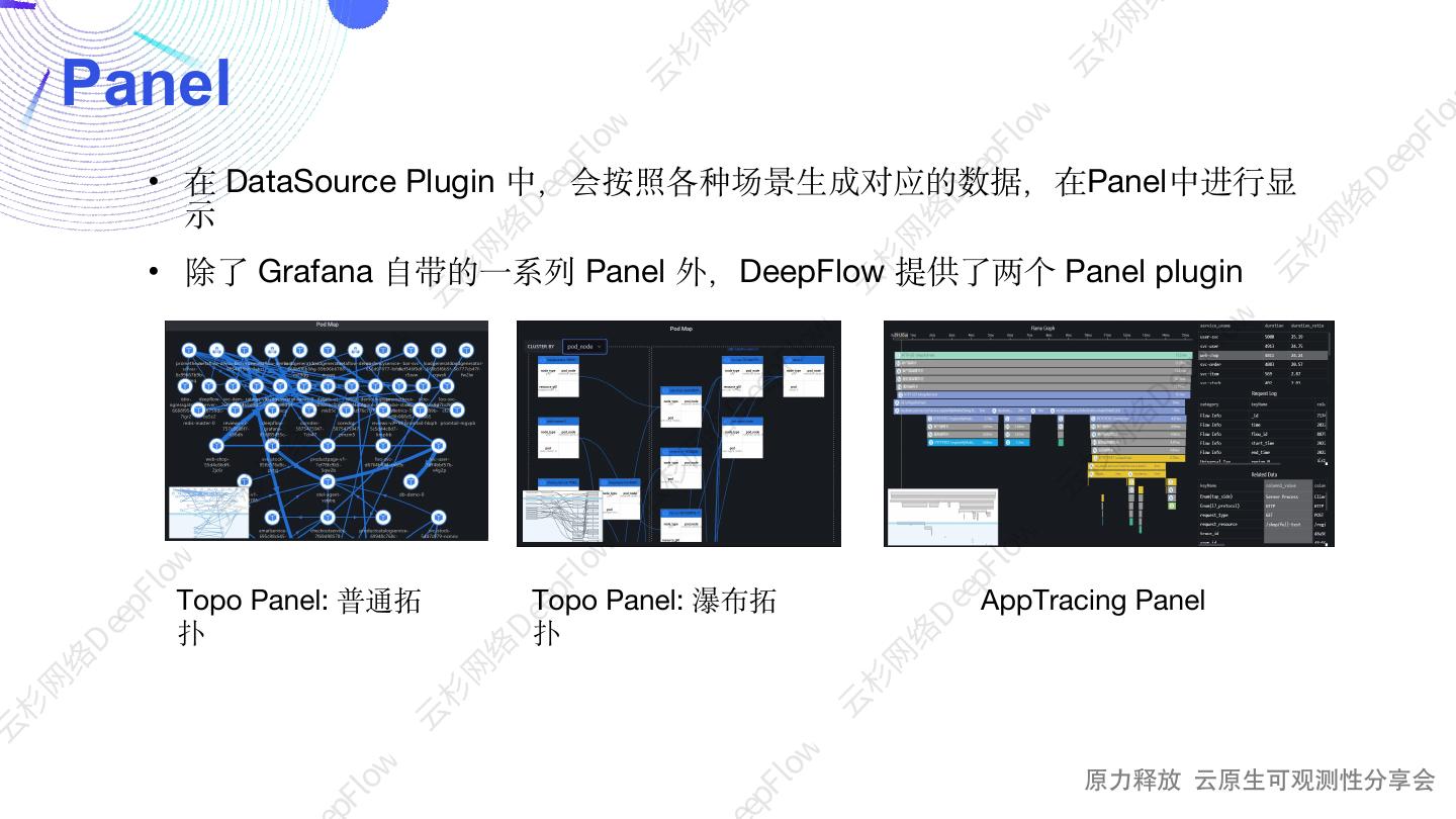 26 . 络 网 网 杉 Panel 杉 云 云 ow o ow l pF l pF l ee pF • 在 DataSource Plugin 中,会按照各种场景生成对应的数据,在Panel中进行显 ee D ee D 络 示 D 络 网 络 网 杉 网 • 除了 Grafana 自带的一系列 Panel 外,DeepFlow 提供了两个 Panel plugin 杉 云 杉 云 云 ow ow w l pF l lo pF ee pF ee D ee D 络 D 络 网 络 网 杉 网 杉 云 杉 云 云 ow ow ow Fl Fl p Topo Panel: 普通拓 Topo Panel: 瀑布拓 AppTracing Panel Fl ee p ee p D ee 扑 扑 D 络 D 络 网 络 网 杉 网 杉 云 杉 云 云 w ow lo 原力释放 云原生可观测性分享会 pF Fl