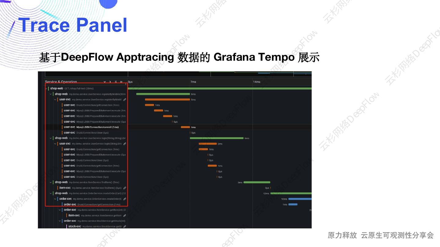 8 . 云 杉 网 络 D ee p Fl ow 云 杉 网 络 D ee Fl pF ow lo 应用调用链追踪 w 云 云 杉 杉 网 网 络 络 D D ee p Fl ee pF ow l ow 云 云 杉 杉 网 网 络 络 D DeepFlow Grafana模板 pF ee lo pF w l ow 云 云 杉 杉 网 网 络 络 D D ee p Fl ee pF ow l ow 云 云 杉 杉 网 网 络 D ee pF l ow 云 杉 网 络 D ee pF 原力释放 云原生可观测性分享会 l o